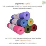 - Ergonomic Colors – Did you know the right choice of colors on your yoga mat can help enhance relaxation during postures where you lie closer to the ground? 366.Factory yoga mats are made using such well researched ergonomic colors.