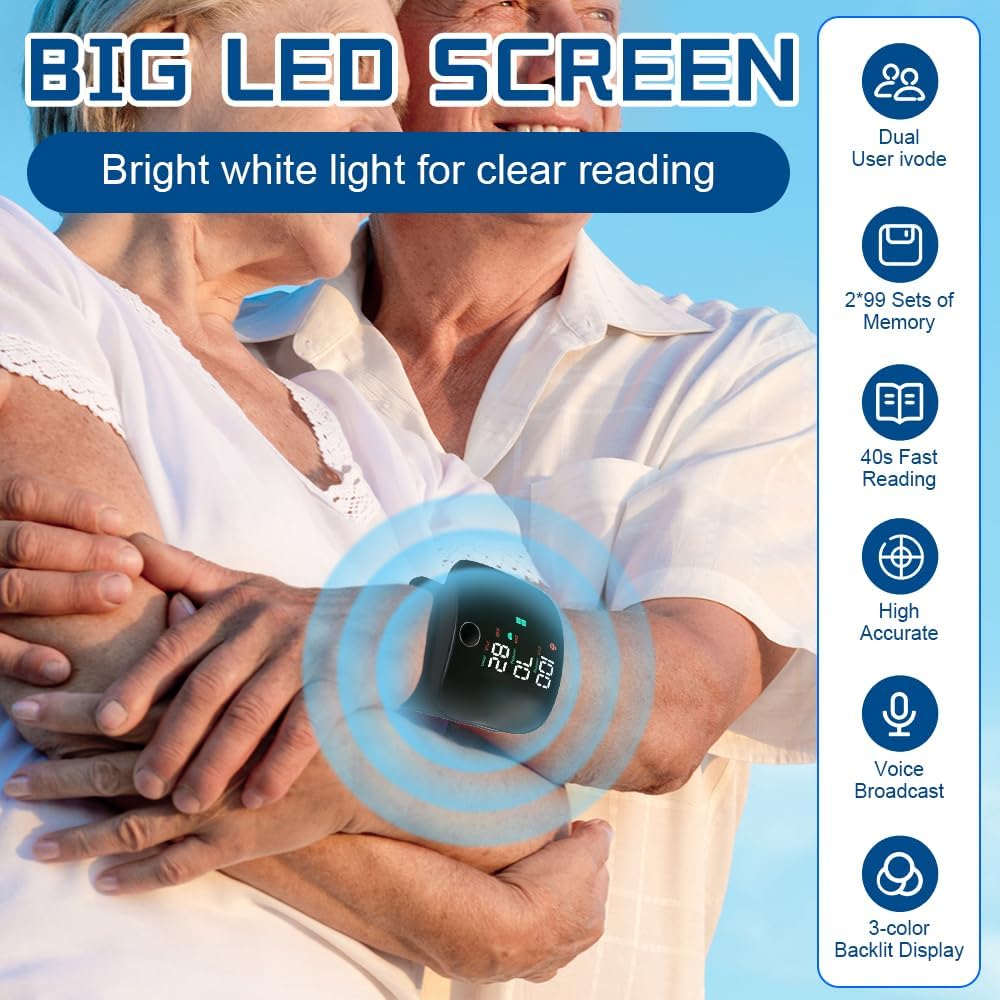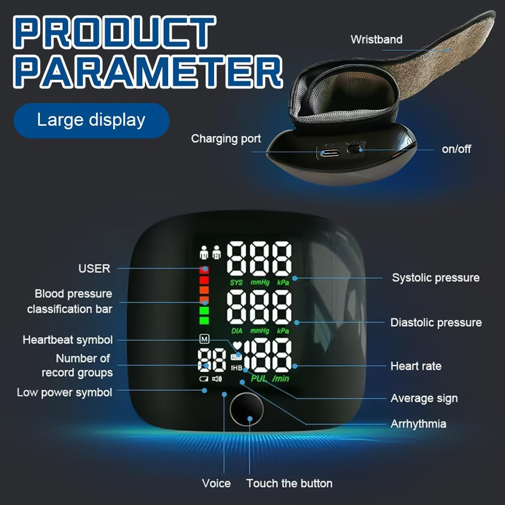 Wrist Blood Pressure Monitor with Large LCD Display, Automatic English Voice Output, Digital Wrist Blood Pressure Monitor with 2 x 99 Memory Spaces